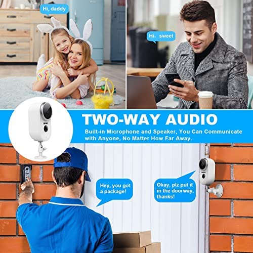 Audio bidireccional y resistente al agua: la cámara de seguridad para el hogar tiene un micrófono y un altavoz integrados que admiten llamadas de audio bidireccionales en tiempo real. Con la aplicación móvil ADORCAM, puede advertir a los ladrones, controlar a los visitantes en su puerta o comunicarse directamente con su familia o amigos. Esta cámara de seguridad recargable puede soportar la lluvia y temperaturas que van desde -4 °F a 122 °F, lo que le permite funcionar en casi cualquier clima.